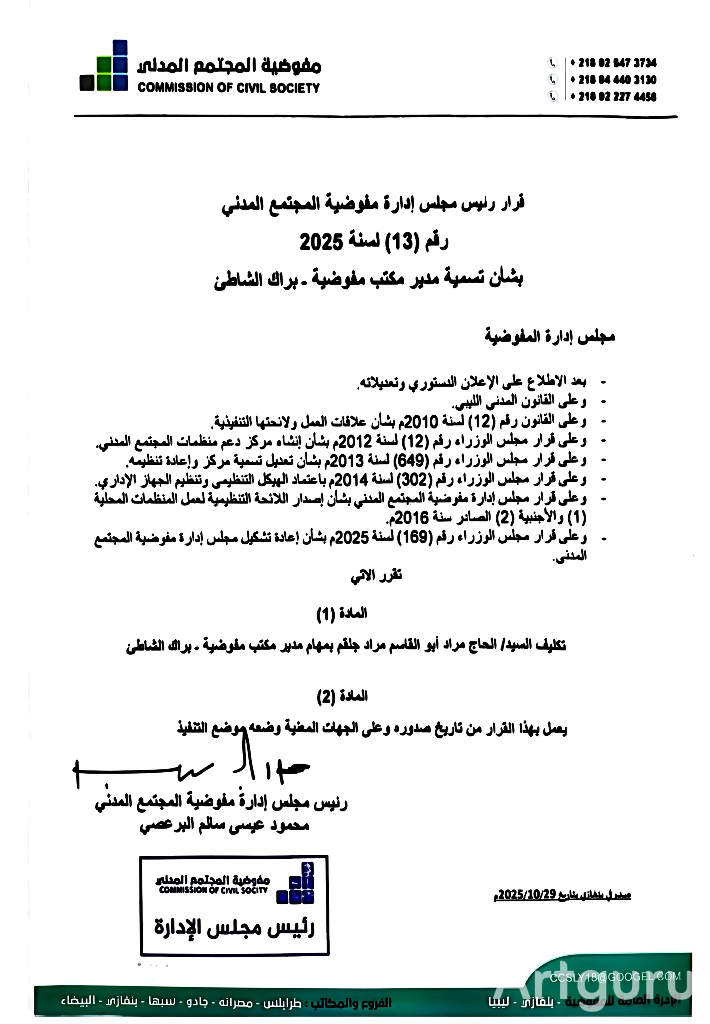 قرار رئيس مجلس إدارة مفوضية المجتمع المدني رقم (13) لسنة 2025م بشأن تسمية مدير مكتب مفوضية – براك الشاطئ