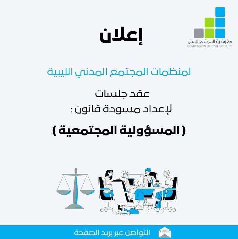 تعلن مفوضية المجتمع المدني عن إطلاق مبادرة وطنية تقودها منظمات المجتمع المدني في ليبيا، لعقد سلسلة جلسات حوارية وورش عمل تشاركية تهدف إلى إعداد مسودة قانون ((المسؤولية المجتمعية في ليبيا))، وذلك لتعزيز الإطار القانوني الذي يدعم الممارسات المجتمعية والتنموية المستدامة.