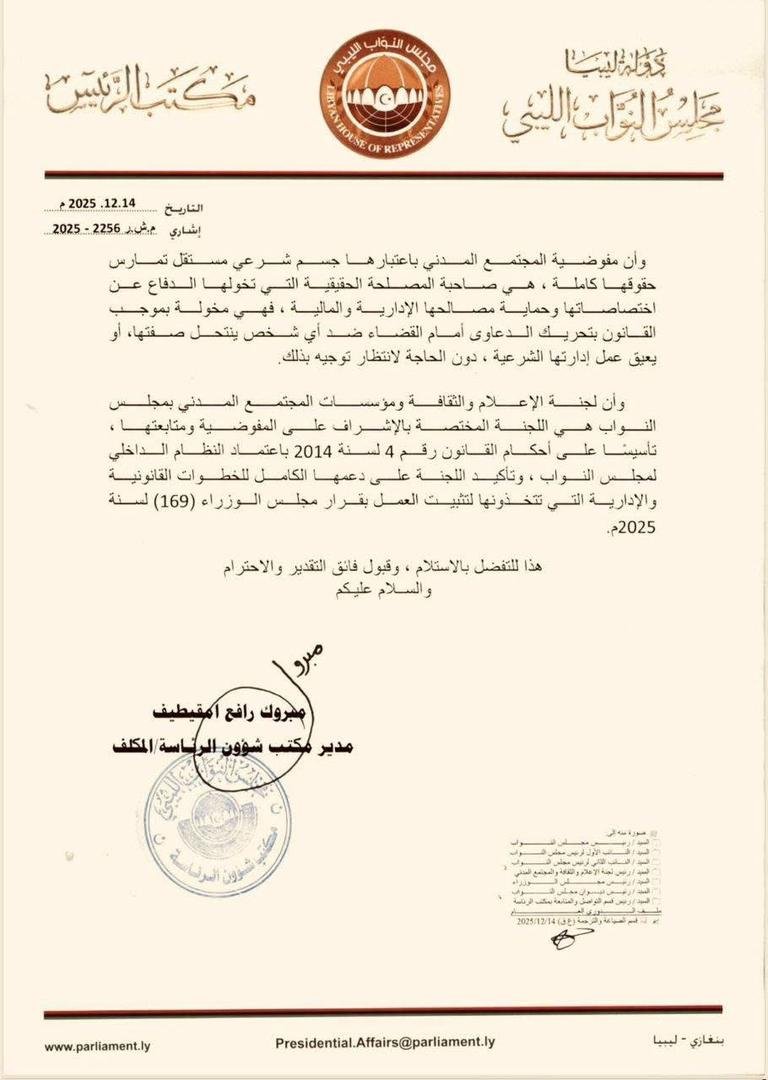 المدونة قرارات الاخبار التقارير النصائح الفعاليات الإعلانات الأخبار مفوضية المجتمع المدني تعقد اجتماعًا تنسيقيًا مع منظمات المجتمع المدني في بنغازي ضمن مشروع الأمن المجتمعي عقدت مفوضية المجتمع المدني اجتماعًا تنسيقيًا مع عدد من ممثلي منظمات المجتمع 2026-01-13 المزيد الأخبار وزارة الداخلية ومفوضية المجتمع المدني تنظمـان ندوة توعوية حول الأمن المجتمعي ببنغازي عُقدت يوم أمس الخميس الموافق 1 يناير 2026م، في القاعة الرئيسية لوزارة 2026-01-02 المزيد قرارات الاخبار التقارير النصائح الفعاليات الإعلانات الأخبار مفوضية المجتمع المدني تعقد اجتماعًا تنسيقيًا مع منظمات المجتمع المدني في بنغازي ضمن مشروع الأمن المجتمعي عقدت مفوضية المجتمع المدني اجتماعًا تنسيقيًا مع عدد من ممثلي منظمات المجتمع 2026-01-13 المزيد الأخبار وزارة الداخلية ومفوضية المجتمع المدني تنظمـان ندوة توعوية حول الأمن المجتمعي ببنغازي عُقدت يوم أمس الخميس الموافق 1 يناير 2026م، في القاعة الرئيسية لوزارة 2026-01-02 المزيد الأخبار اجتماع بديوان وزارة الخارجية لمناقشة ملف عمل المنظمات الأجنبية والمحلية بدعوة من سيادة وزير الخارجية، عُقد صباح اليوم الاثنين الموافق 15 ديسمبر 2025-12-15 المزيد قرارات الاخبار التقارير النصائح الفعاليات الإعلانات المستجدات قرارات مجلس إدارة مفوضية المجتمع المدني القرار رقم (2025/3) بشأن تعديل اللائحة التنظيمية لعمل المنظمات الأجنبية في ليبيا رقم (2016/2) 2026-02-02 10:25 ص قرارات مجلس إدارة مفوضية المجتمع المدني القرار رقم (2025/2) بشأن تعديل اللائحة التنظيمية لمنظمات المجتمع المدني المحلية رقم (2016/1) 2026-02-02 10:23 ص قرارات قرار رئيس مجلس إدارة مفوضية المجتمع المدني رقم (3) لسنة 2025م بشأن تسمية مدير مكتب بلدية الغريفة 2026-02-01 11:56 ص قرارات قرار رئيس مجلس إدارة مفوضية المجتمع المدني رقم (2) لسنة 2025م بشأن تسمية رئيس فرع سبها 2026-02-01 11:51 ص فعـــالــيــات المزيد فعاليات مفوضية المجتمع المدني تنظم فعالية توعوية مفتوحة لتعزيز ثقافة العمل التطوعي نظّمت مفوضية المجتمع المدني فعالية توعوية مفتوحة في أحد الأماكن العامة، بهدف 2025-12-27 المزيد فعاليات جلسة تشاورية تجمع مفوضية المجتمع المدني ومنظمات المجتمع المدني لمناقشة التحديات الراهنة عقدت مفوضية المجتمع المدني جلسة تشاورية بمشاركة عدد من ممثلي منظمات المجتمع 2025-12-27 المزيد فعاليات مفوضية المجتمع المدني تنظم ورشة عمل حول بناء القدرات المؤسسية للمنظمات الأهلية نظّمت مفوضية المجتمع المدني ورشة عمل متخصصة حول بناء القدرات المؤسسية لمنظمات 2025-12-27 المزيد تقــــاريــر المزيد تقارير دليل المنظمات الدولية غير الحكومية العاملة في ليبيا – 2020 مقدمةيقدّم هذا التقرير دليلًا توثيقيًا محدثًا للمنظمات الدولية غير الحكومية العاملة في 2025-12-26 المزيد تقارير المرأة الليبية ومنظمات المجتمع المدني مقدمةيتناول هذا التقرير واقع مشاركة المرأة الليبية في منظمات المجتمع المدني، ويسلط 2025-12-26 المزيد تقارير حقوق الليبيين العاملين في منظمات المجتمع المدني الأجنبية والدولية مقدمةيتناول هذا التقرير أوضاع وحقوق الليبيين العاملين في منظمات المجتمع المدني الأجنبية 2025-12-26 المزيد الإعلانات المزيد إعلان قرار رئيس مجلس إدارة مفوضية المجتمع المدني رقم (1) لسنة 2026م 2026-01-12 8:17 ص إعلان تنبيه للمنظمات الأجنبية غير الحكومية بشأن الالتزام بالقوانين واللوائح المنظمة لعملها في ليبيا 2026-01-08 9:29 ص إعلان تنبيه رسمي بشأن عدم الاعتداد بأي قرارات أو إجراءات صادرة عن جهة غير ذات صفة قانونية 2025-12-15 10:10 م اشتـــرك في نشــرة البريـــــد Email الاسم اشتراك شارك على مواقع التواصل Facebook-f Twitter Youtube Linkedin