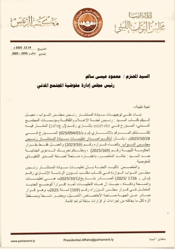 استنادًا إلى تعليمات سيادة المستشار رئيس مجلس النواب، وبالنظر إلى أن قرار مجلس الوزراء رقم (169) لسنة 2025م، الصادر بشأن إعادة تشكيل مجلس إدارة مفوضية المجتمع المدني برئاسة السيد محمود عيسى البرعصي، يُعدّ قرارًا صادرًا عن الجهة صاحبة الاختصاص الأصيل، فإنه يُعتبر ناسخًا ومُسقطًا للأثر القانوني لكافة الإجراءات والقرارات السابقة المخالفة له، والتي لم تعد قائمة قانونًا.