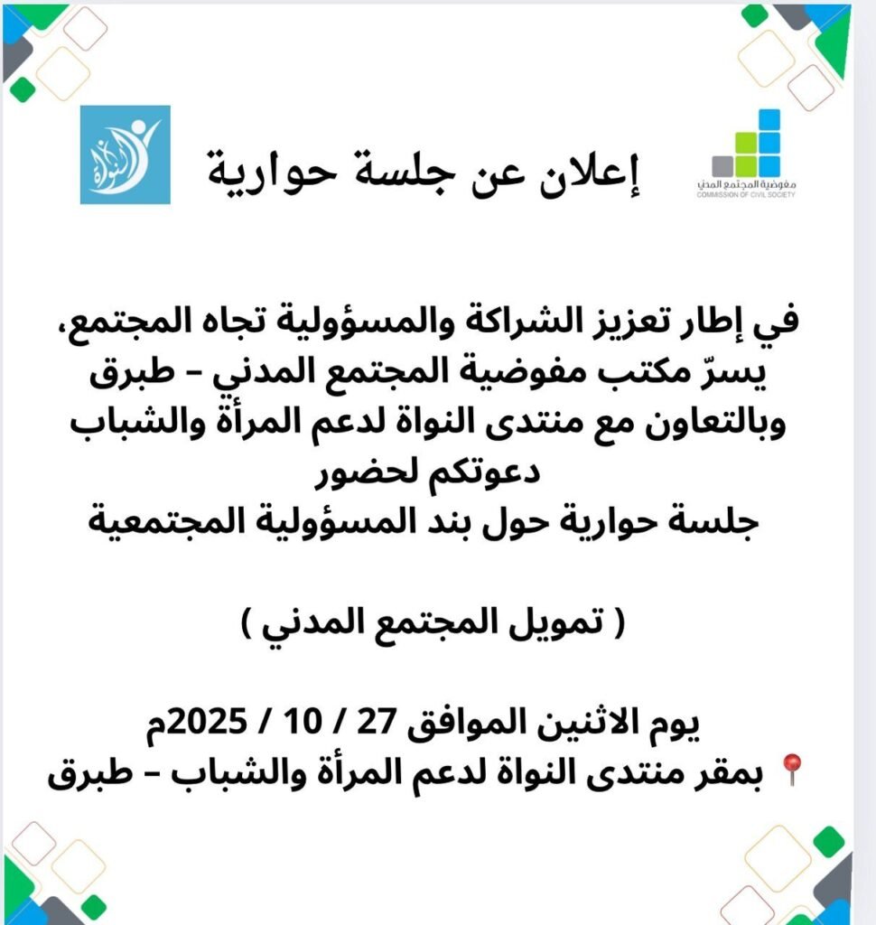 تشرف #مفوضية_المجتمع_المدني_طبرق، بالتعاون مع #منتدى_النواة لدعم المرأة والشباب، بدعوتكم لحضور جلسة حوارية بعنوان: