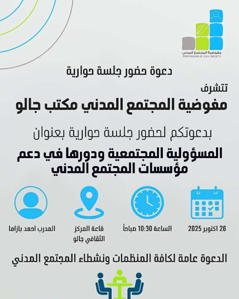 تتشرف مفوضية المجتمع المدني_جالو، بالتعاون مع مؤسسة الفرسان للتنمية، بدعوتكم لحضور جلسة حوارية بعنوان: