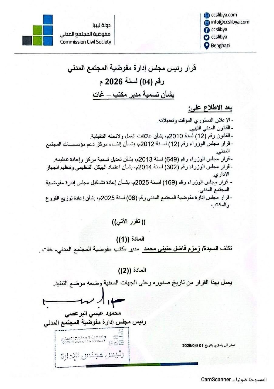 “قرارا رئيس مجلس إدارة مفوضية المجتمع المدني رقما (4) و(5) لسنة 2026م ، بشأن تسمية مديري مكتبي غات ووادي عتبة.”