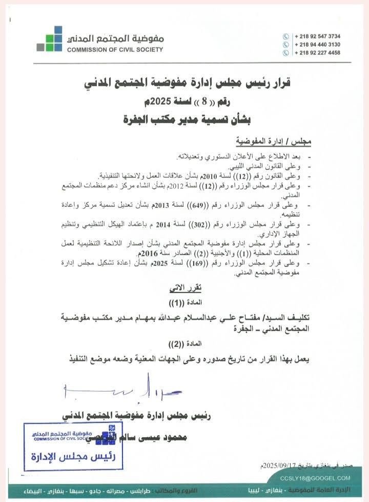 قرار رئيس مجلس إدارة مفوضية المجتمع المدني رقم (8) لسنة 2025م بشأن تسمية مدير مكتب الجفرة