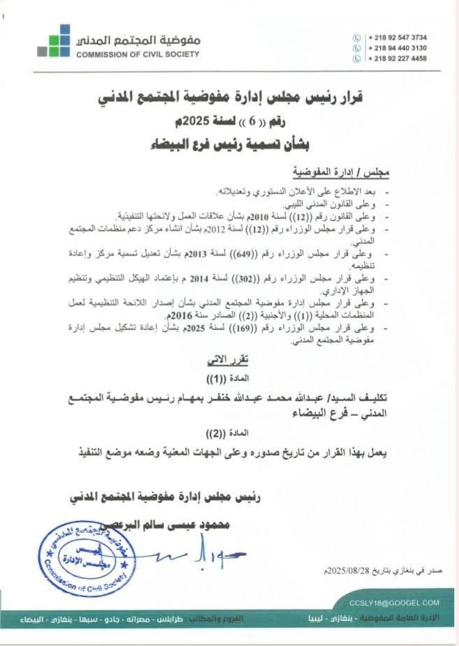 قرار رئيس مجلس إدارة مفوضية المجتمع المدني رقم (6) لسنة 2025م بشأن تسمية رئيس فرع البيضاء
