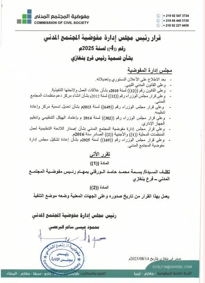 قرار رئيس مجلس إدارة مفوضية المجتمع المدني رقم (4) لسنة 2025م بشأن تسمية رئيس فرع بنغازي