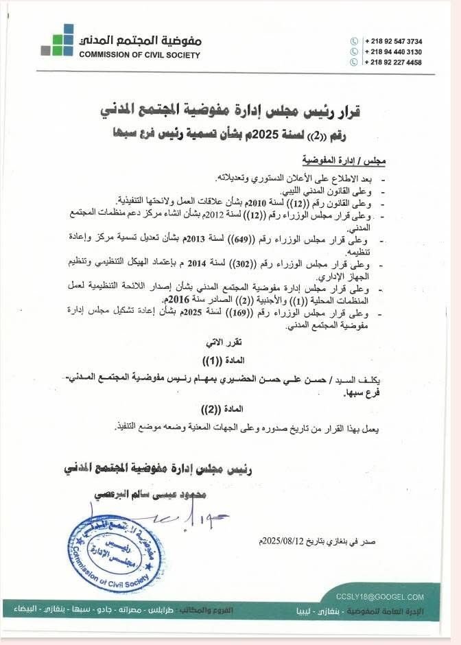 قرار رئيس مجلس إدارة مفوضية المجتمع المدني رقم (2) لسنة 2025م بشأن تسمية رئيس فرع سبها