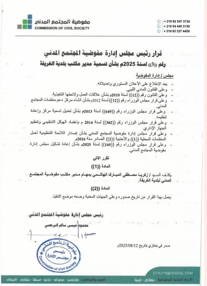 قرار رئيس مجلس إدارة مفوضية المجتمع المدني رقم (9) لسنة 2025م بشأن تسمية مدير مكتب مفوضية المجتمع المدني طبرق