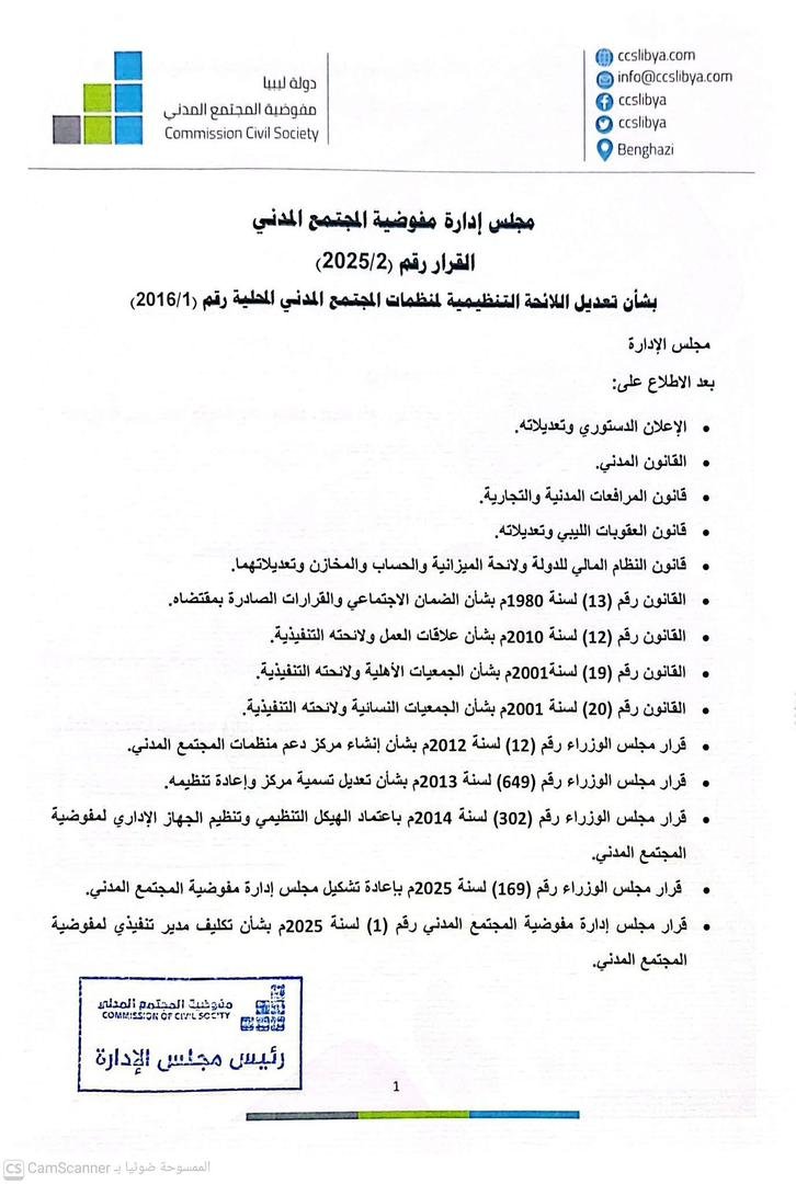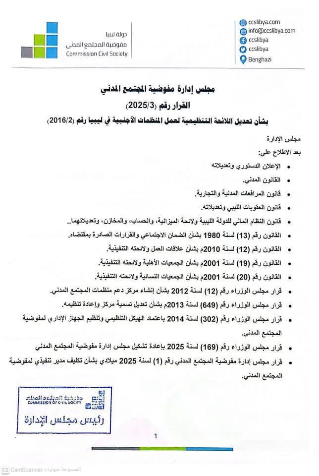 مجلس إدارة مفوضية المجتمع المدني القرار رقم (2025/3) بشأن تعديل اللائحة التنظيمية لعمل المنظمات الأجنبية في ليبيا رقم (2016/2)