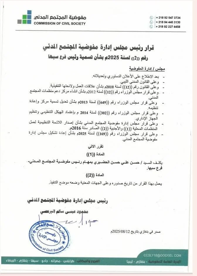 Decision No. (2) of 2025 issued by the Chairman of the Board of Directors of the Civil Society Commission regarding the appointment of the head of the Sabha branch.